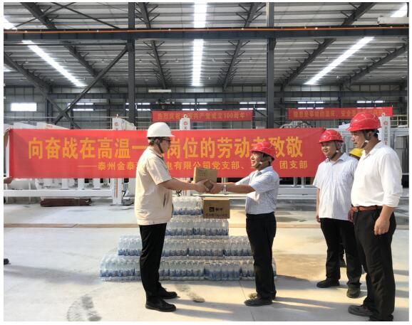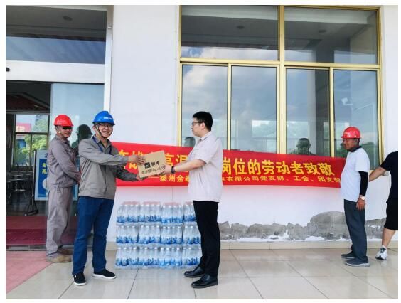 新型建材项目刚刚投产不久,员工的工作环境相对比较复杂,总经办经理周志丹代表公司慰问一线职工,叮嘱他们在坚守工作岗位、抓紧生产进度的同时,注意劳逸结合,做好防暑降温工作,加强自我保护。同时周经理也向相关的外协单位送去了清凉,嘱咐相关方负责人,施工时一定要做好安全措施和防暑降温工作,更要牢记安全生产,保证施工质量。
